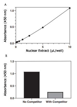 (A) 使用转录因子NF-κB(人类p65)阳性对照产生的典型数据。 (B) dsDNA竞争剂对阳性对照在吸光度上的典型数据。