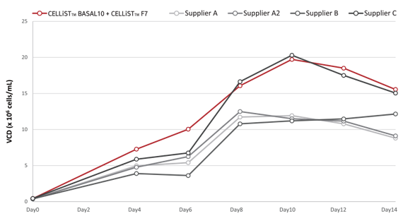 图1所示:采用表达IgG1抗体的CHO-K1细胞系,在125 mL Erlenmeyer烧瓶系统中进行补料批处理。celllisttm组分别于第4、6、8、10、12天以6% (v/v)的浓度饲喂。A、A2、B和C代表来自主要媒体供应商的基础/饲料媒体组合。按照各厂家的推荐进行培养和饲养方式。