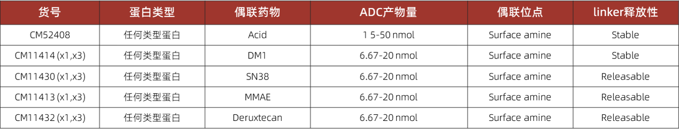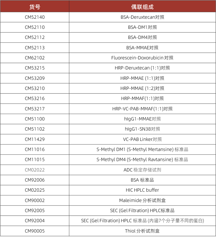 CellMosaic同时提供各种预制的药物偶联物,包括BSA、HRP、生物素化、荧光标记以及其他生物聚合物偶联物,以及ADC存储buffer,BSA标准品,HPLCbuffer,HPLC标准品等,以提供更全面的ADC解决方案。