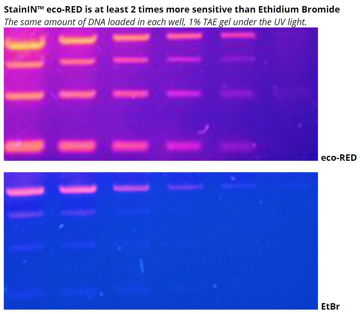 StainIN eco-RED 核酸染料是一种 10000X 浓缩水溶液,是溴化乙锭的明显更安全的替代品。它同样易于使用,灵敏度是原来的两倍,安全性也更高。与溴化乙锭相比,这种新型不含DMSO的染色剂的经济性至少是竞争产品的两倍,而且使用和处置对环境和健康的担忧也较少。StainIN eco-RED 是一种荧光染料,可在琼脂糖和聚丙烯酰胺凝胶中检测 >0.1 ng DNA。它与 ds DNA、ssDNA 和 RNA 结合,并发出红色荧光,可在 LED 或 UV 光下检测到,并使用与溴化乙锭相同的滤光片进行记录。对于克隆应用,建议使用 LED 灯。该染料的致癌性低于溴化乙锭,已通过Ames试验得到证明。