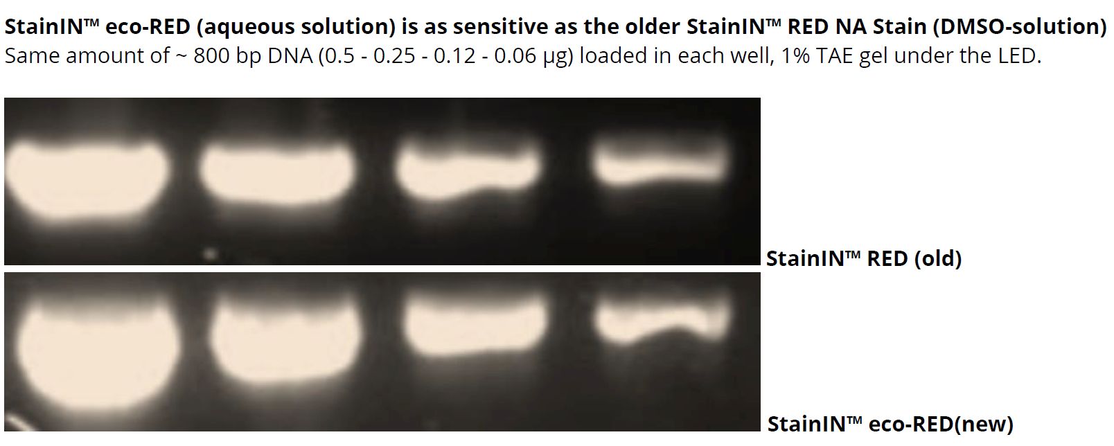 · StainIN eco-RED NA 染色剂更灵活 – 在紫外线和 LED 光下均可检测到。