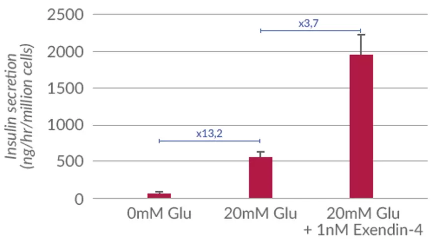 Fig:EndoC-βH5细胞在葡萄糖(20mM)和低浓度GLP1R激动剂Exendin-4 (1nM)的作用下非常有效地分泌胰岛素