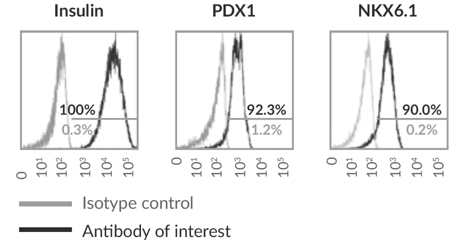 Fig:高功能人β细胞均质群体:>99%胰岛素高细胞,>90% PDX1和NKX6.1, GLP1/GIP受体表达