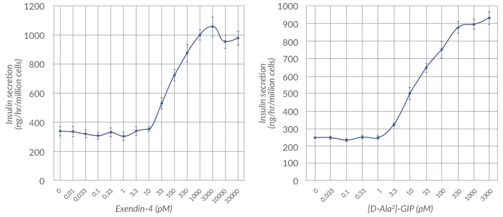 Fig:EndoC-βH5细胞对肠促胰岛素类似物Exendin-4 (GLP1受体激动剂)(左图)和[D-Ala2]-GIP (GIP受体激动剂)(右图)有剂量依赖性反应