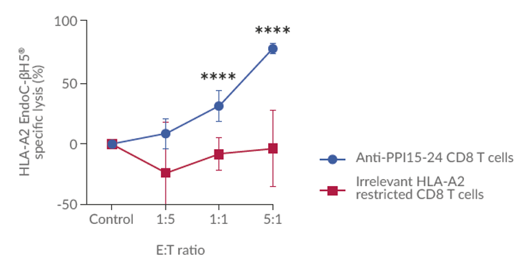Fig:HLA-A2 EndoC-βH5细胞相对裂解:HLA-A2限制性抗ppi15 -24或无关CD8 T淋巴细胞相对于EndoC-βH5细胞裂解HLA-A2 EndoC-βH5细胞,n=3, ****, p< 0.001,未配对T检验