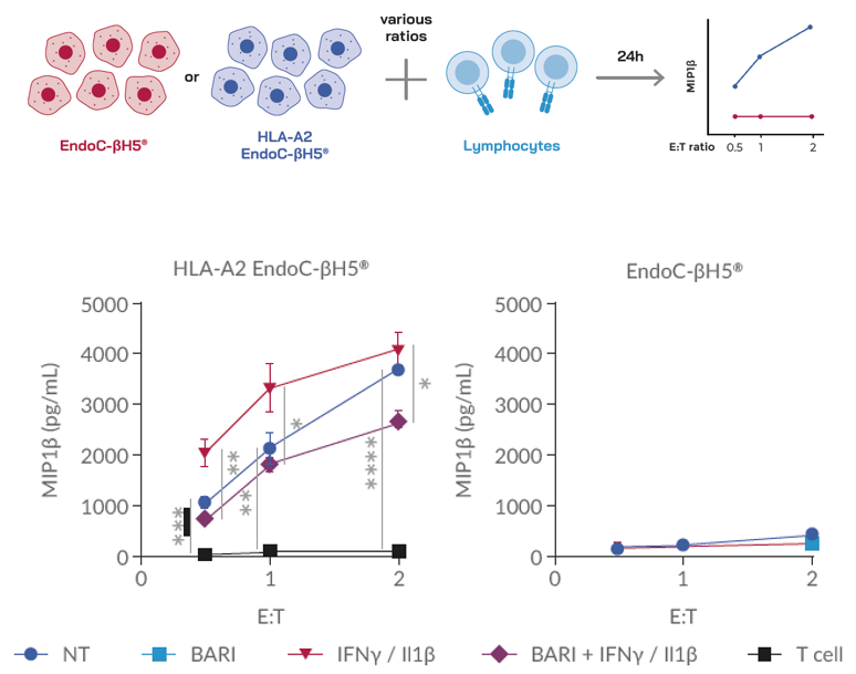 Fig:CD8 T细胞活化:Allo-HLA-A2反应性CD8 T细胞被HLA-A2 EndoC-βH5特异性激活(MIP1β分泌),而不是EndoC-βH5细胞。IFNγ/ il - 1β处理可进一步增加CD8 T细胞的活化,JAK1/2抑制剂Baricitinib可部分阻止CD8 T细胞的活化。n = 3,* * * p < 0.05, p < 0.01, * * *, p < 0.001, * * * *, p < 0.0001。(NT:未经治疗)