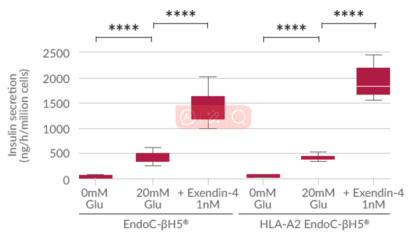 Fig:HLA-A2 EndoC-βH5(左)和野生型EndoC-βH5细胞(右)在葡萄糖和Exendin-4刺激下胰岛素分泌相当,n=10, ****, p<0.0001, 配对t检验。 HLA-A2 EndoC-βH5(左)和野生型EndoC-βH5细胞(右)的贴壁聚集形态相当。光学显微镜,比例尺50µm。
